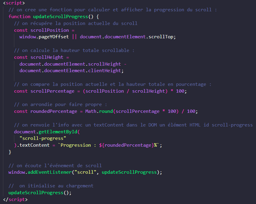La fonction updateScrollProgress() calcule la position actuelle du scroll et la hauteur